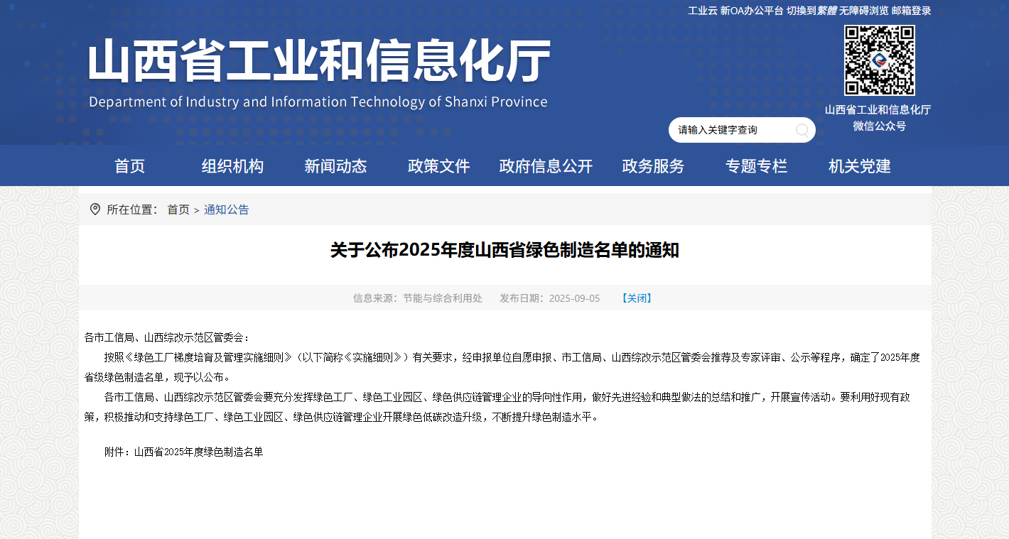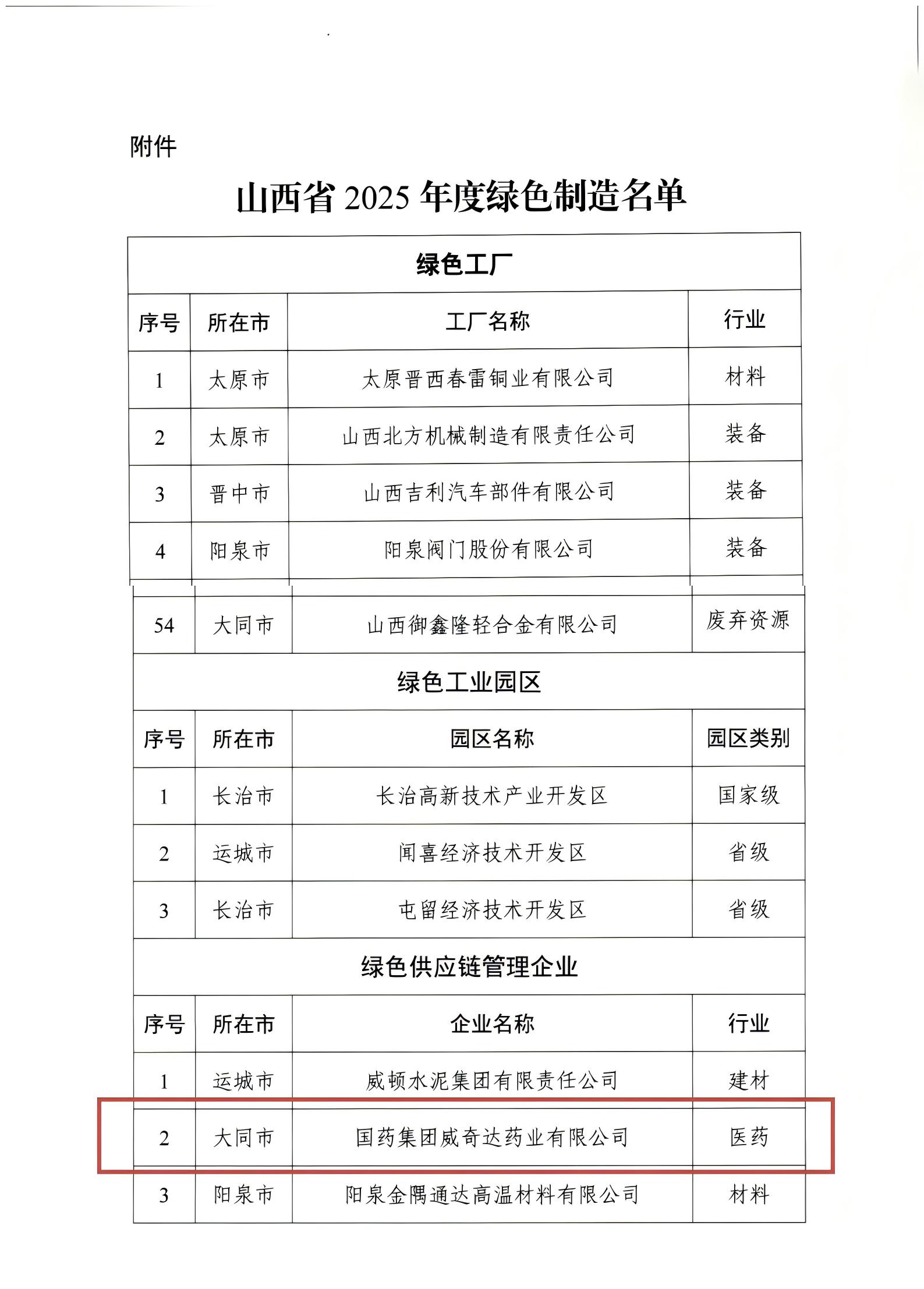 近日,山西省工业和信息化厅公布山西省2025年度绿色制造名单,国药威奇达成功上榜,成为山西省“绿色供应链管理磁力猫”。