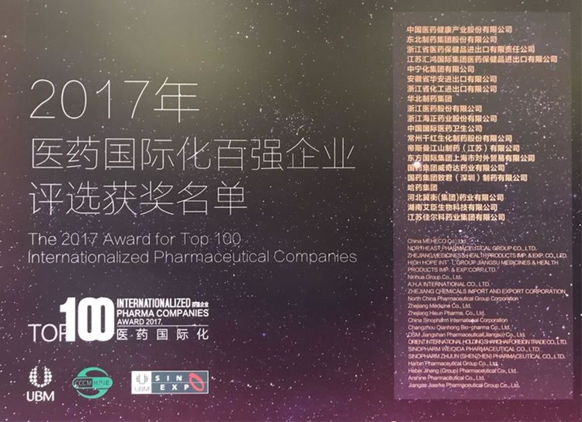 2017年6月19日,由中国医药保健品进出口商会主办的"第八届中国与世界医药企业家高峰会;中国医药产业国际化榜样与行动",在上海国际会议中心隆重召开,2017年度医药国际化百强企业评选获奖名单在高峰会上正式发布。