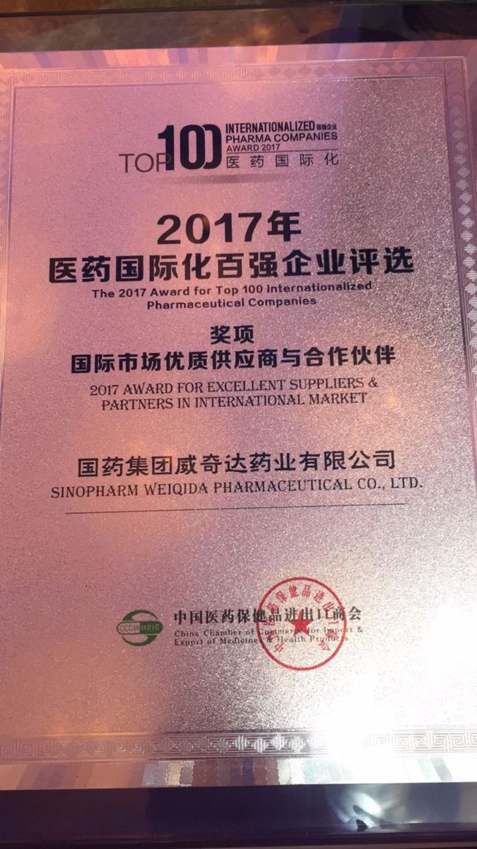 国药威奇达获评“2017年医药国际化百强企业—国际市场优质供应商与合作伙伴”