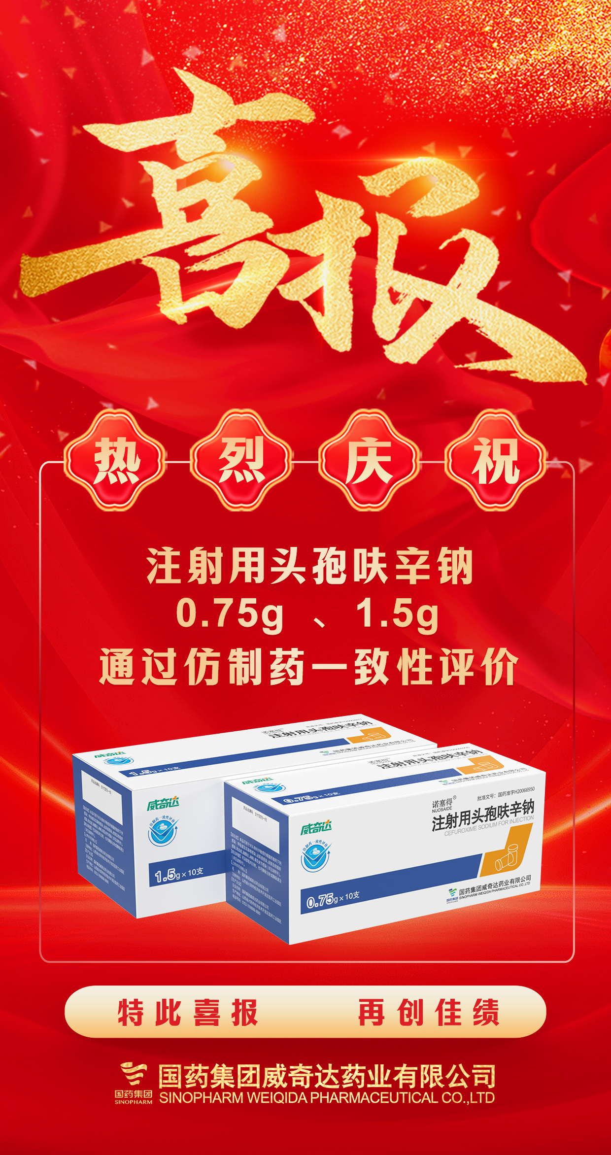 近日,国药威奇达收到国家药品监督管理局核准签发的《药品补充申请批准通知书》,批准注射用头孢呋辛钠(0.75g,1.5g)通过仿制药质量和疗效一致性评价。
