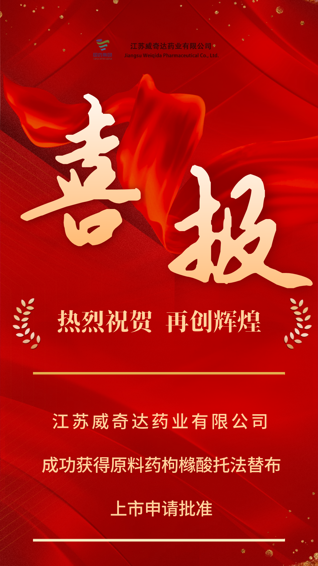近日,子公司国药江苏威奇达收到国家药品监督管理局核准签发的《化学原料药上市申请批准通知书》,批准原料药枸橼酸托法替布上市申请。