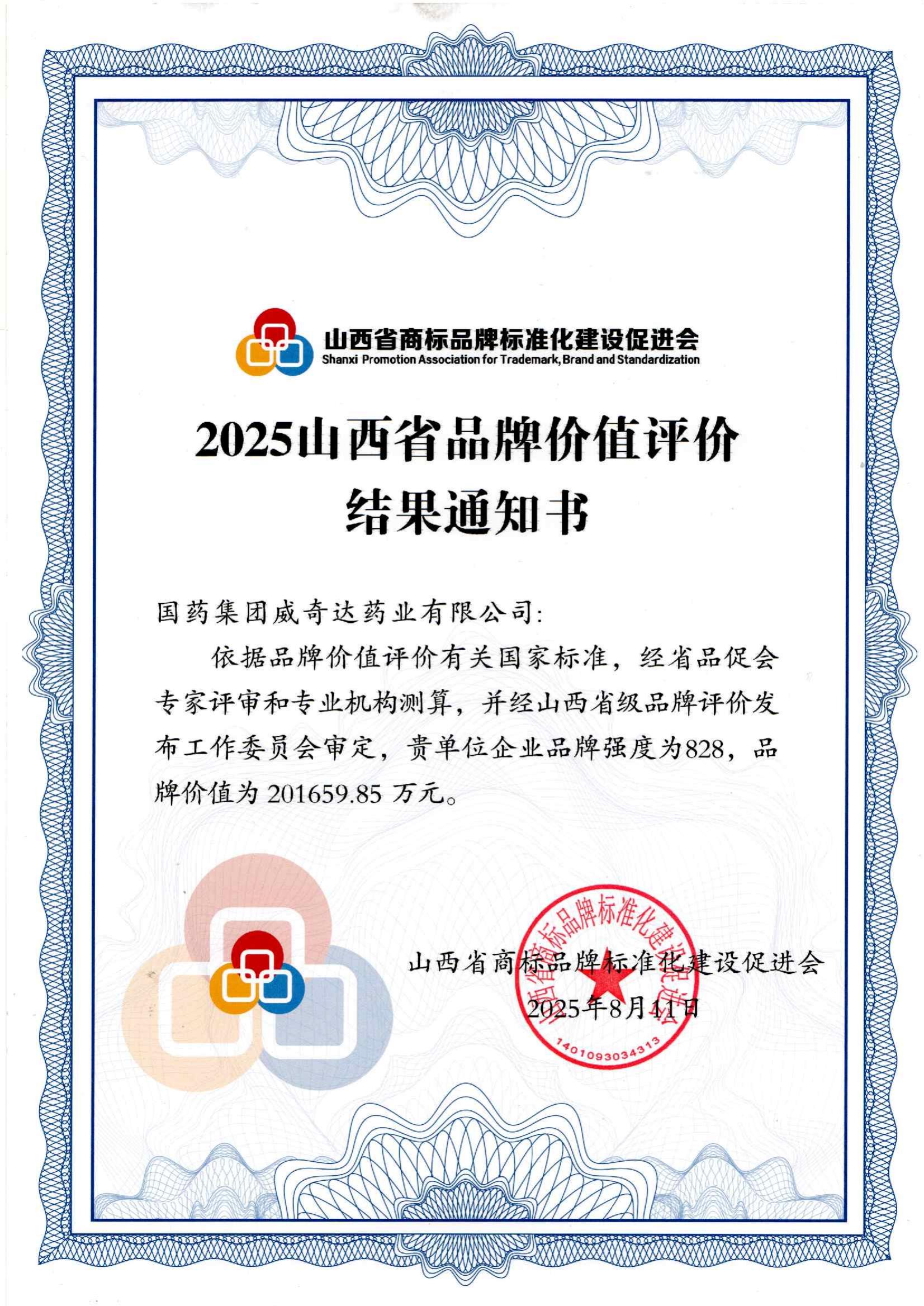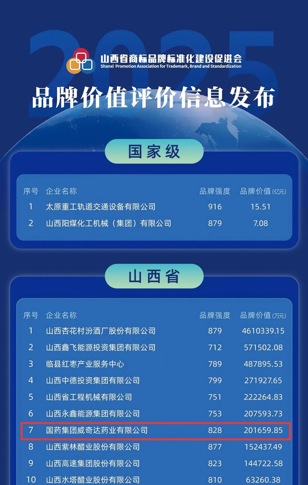 8月11日,首届山西省品牌促进大会暨2025年度山西省品牌价值评价信息发布会在太原召开。会上进行了2025年度山西省品牌价值评价信息发布,国药威奇达以20.17亿元的品牌价值在榜单中名列前茅。