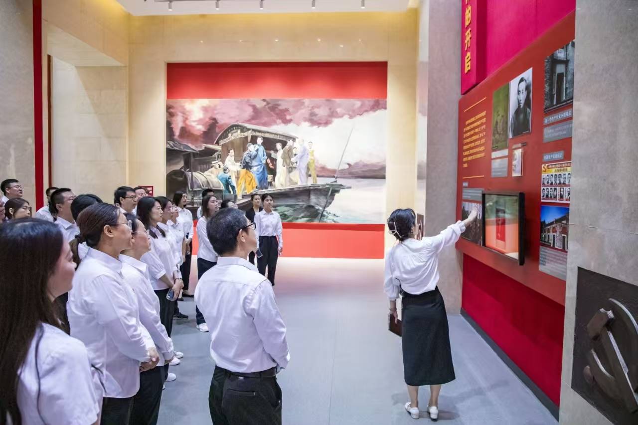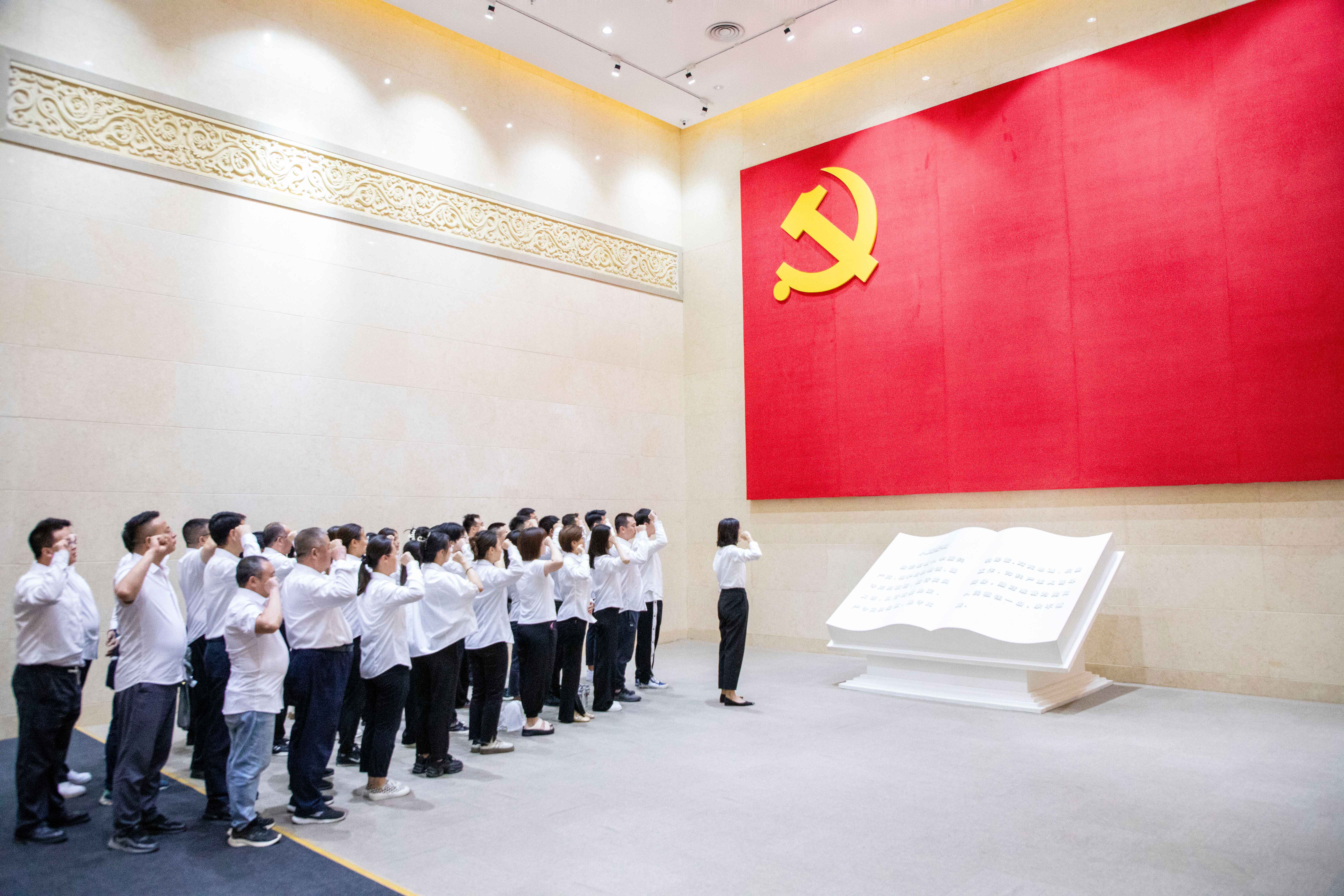 参观结束后,全体党员面对鲜红的党旗,共同高举右拳,重温入党誓词。