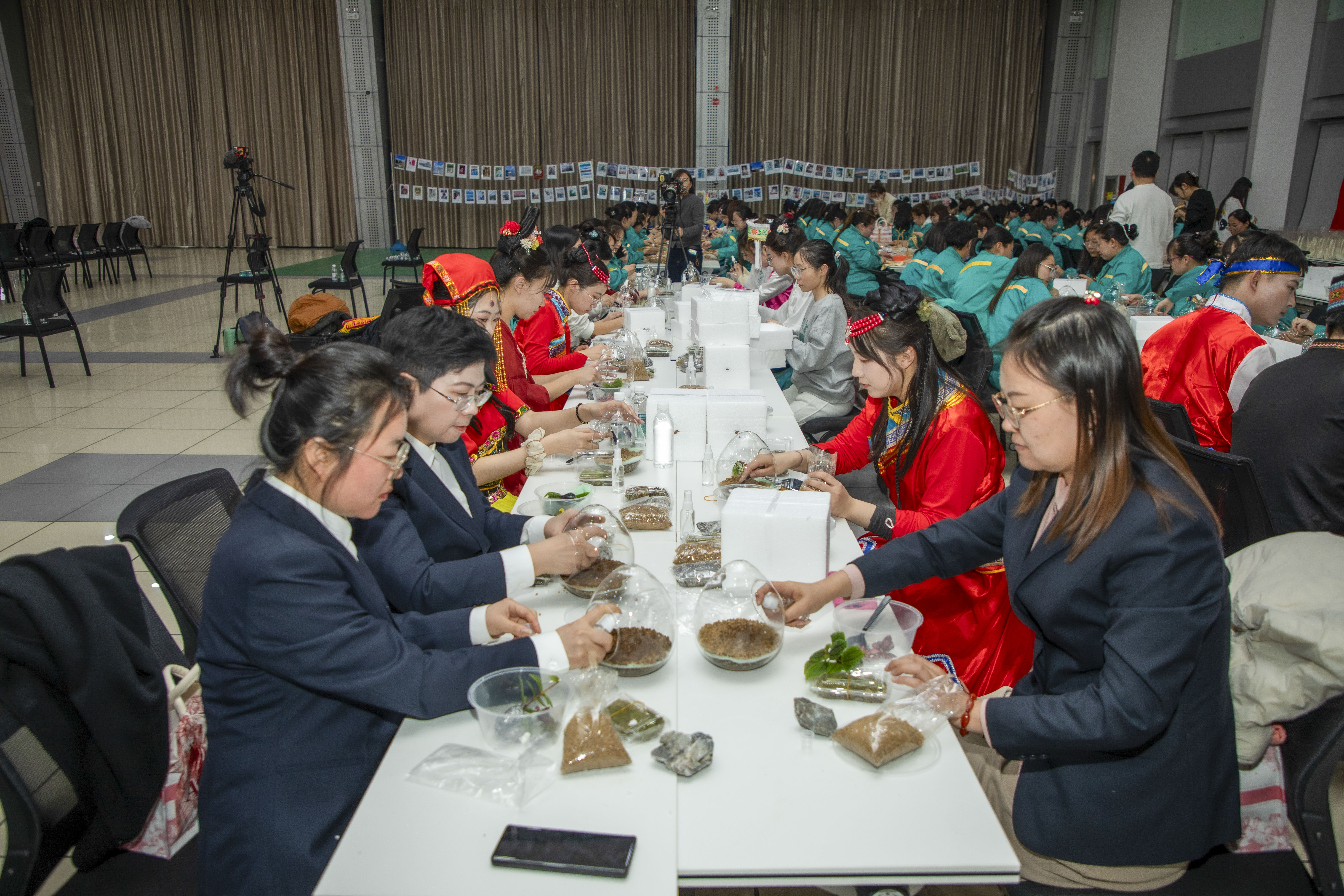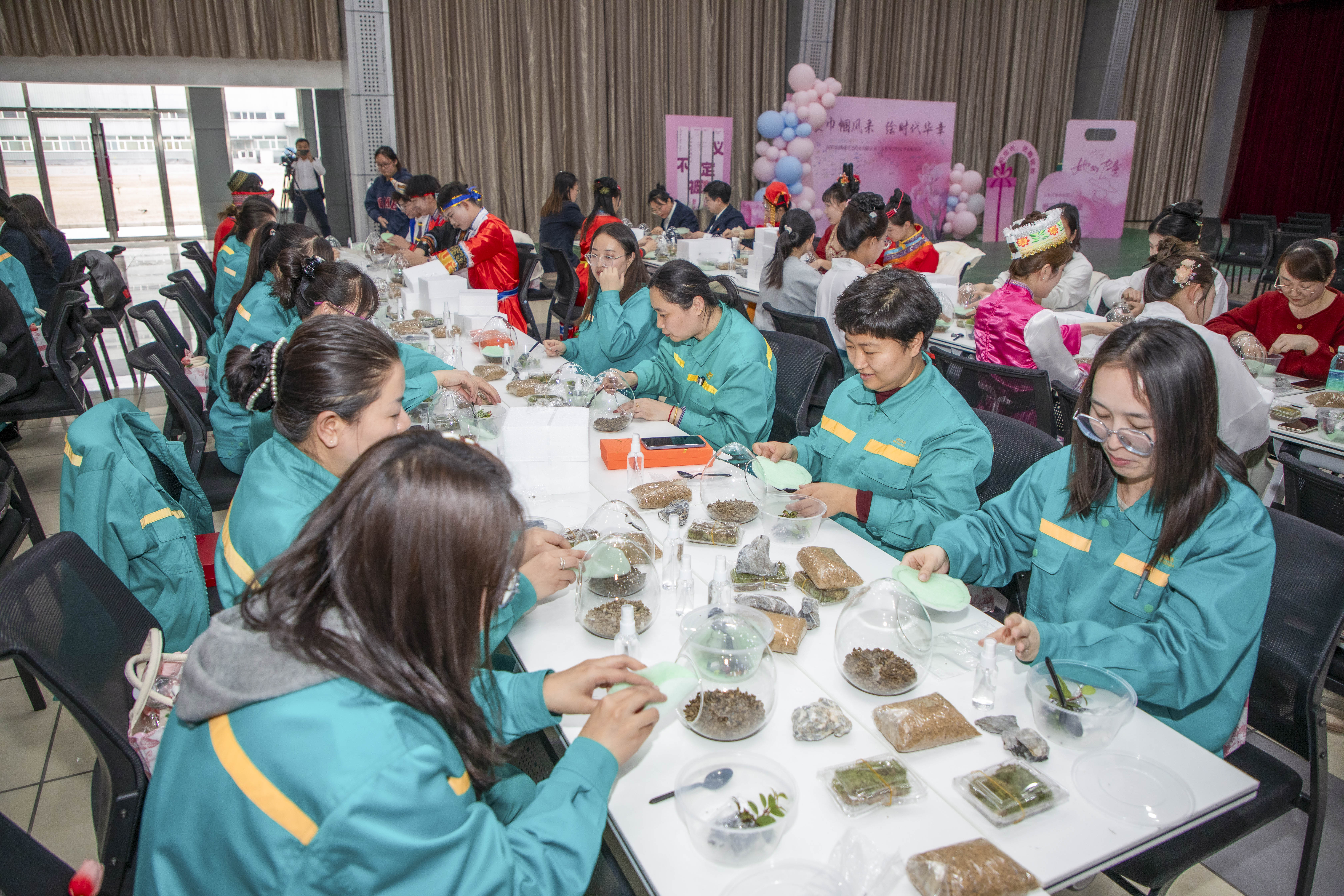 会后,公司组织了丰富多彩的文化活动。在手工制作活动中,工作人员身着绚丽多彩的民族服饰,为活动增添了浓郁的节日氛围。女职工们有的化身能工巧匠,将华丽的扇面精心裁剪,贴合,配合精致的流苏、扇坠,制作出精美的手工团扇,有的化身“自然设计师”,将苔藓、多肉与装饰品巧妙搭配,在容器中打造出一方方生机盎然的微观世界。